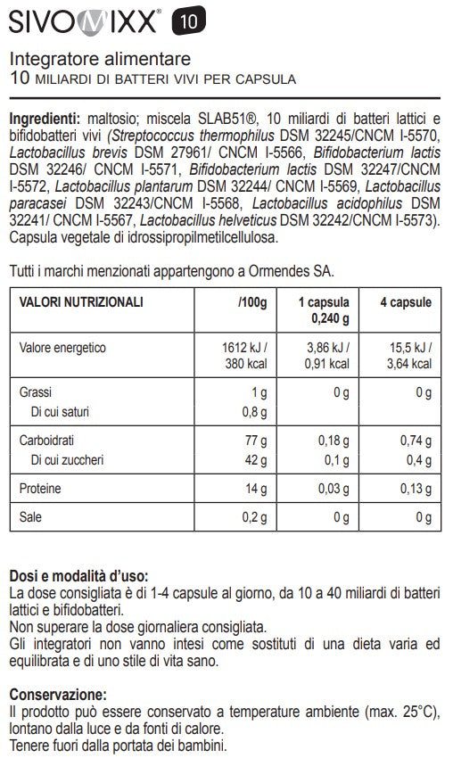 Miscela di almeno 10 miliardi di batteri lattici e bifidobatteri, maltosio. Capsula vegetale di idrossipropil-metil cellulosa.